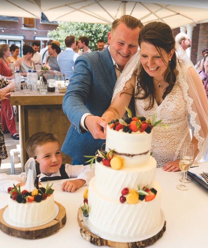‘Vanaf het eerste moment verliep het hele proces rondom onze bruidstaart ontzettend soepel en fijn. Het proefpakketje dat we ontvingen was voorzien van uitgebreide instructies, wat enorm hielp bij het maken van onze keuze. We hebben van deze eerste stap al zo genoten – alle smaken waren zó lekker dat kiezen echt lastig was! Ook het gesprek om alles door te spreken was heel prettig. Op de dag zelf was de taart precies zoals we hadden gehoopt: prachtig en verrukkelijk. Toen er vlak voor de bruiloft nog veranderingen nodig waren vanwege allergieën, werd dat snel en zonder gedoe opgelost. We hebben zelf enorm genoten van de taart, en we kregen ook ontzettend veel complimenten van onze gasten over hoe lekker hij was. De aparte gebakjes voor gasten met allergieën vielen ook erg in de smaak. Wij hadden ons geen betere ervaring kunnen wensen. Heel erg bedankt”!